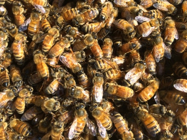 Honeybees after adding honey super on 5-7-14 to orchard hive
